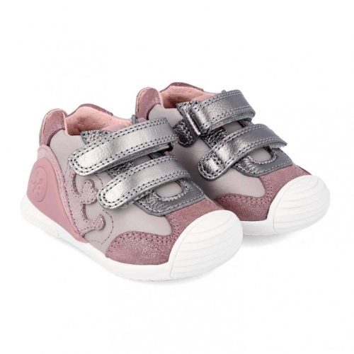 Botines Biomecanics para primeros pasos de niña, en piel gris texturizada con motivos rosas y suela en contraste blanca. Fabricados junto al instituto de biomecanica de Valencia.