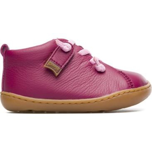 Botines de piel en color rosa para niños con suela de goma cosida. Cordones elásticos y un sistema de autocierre adicional.