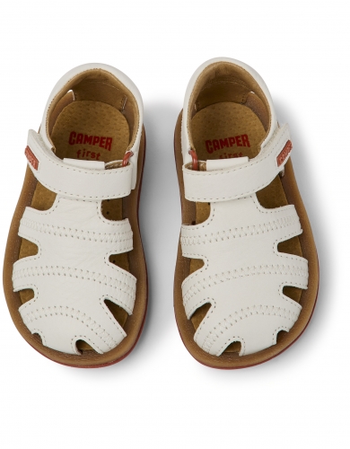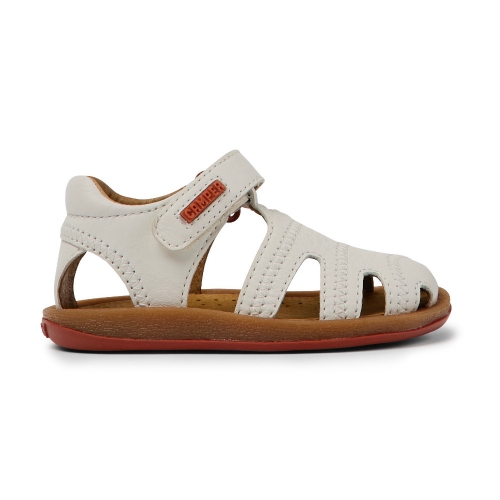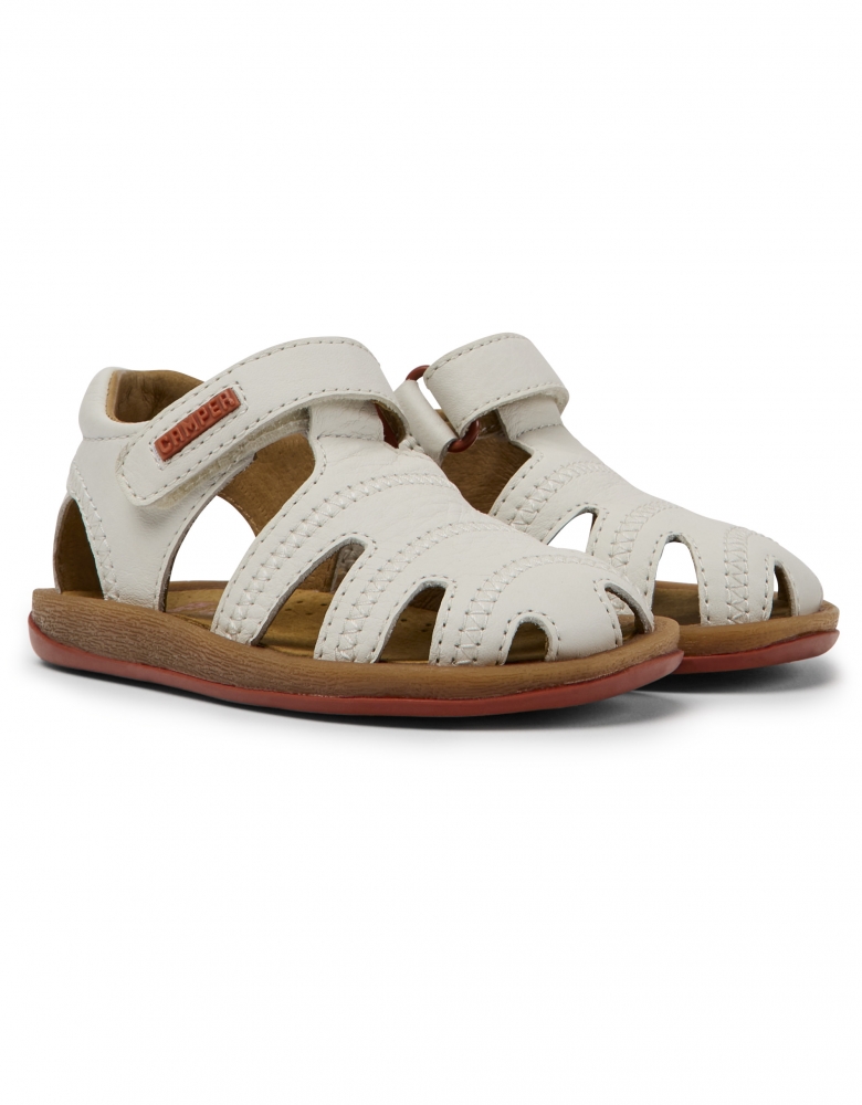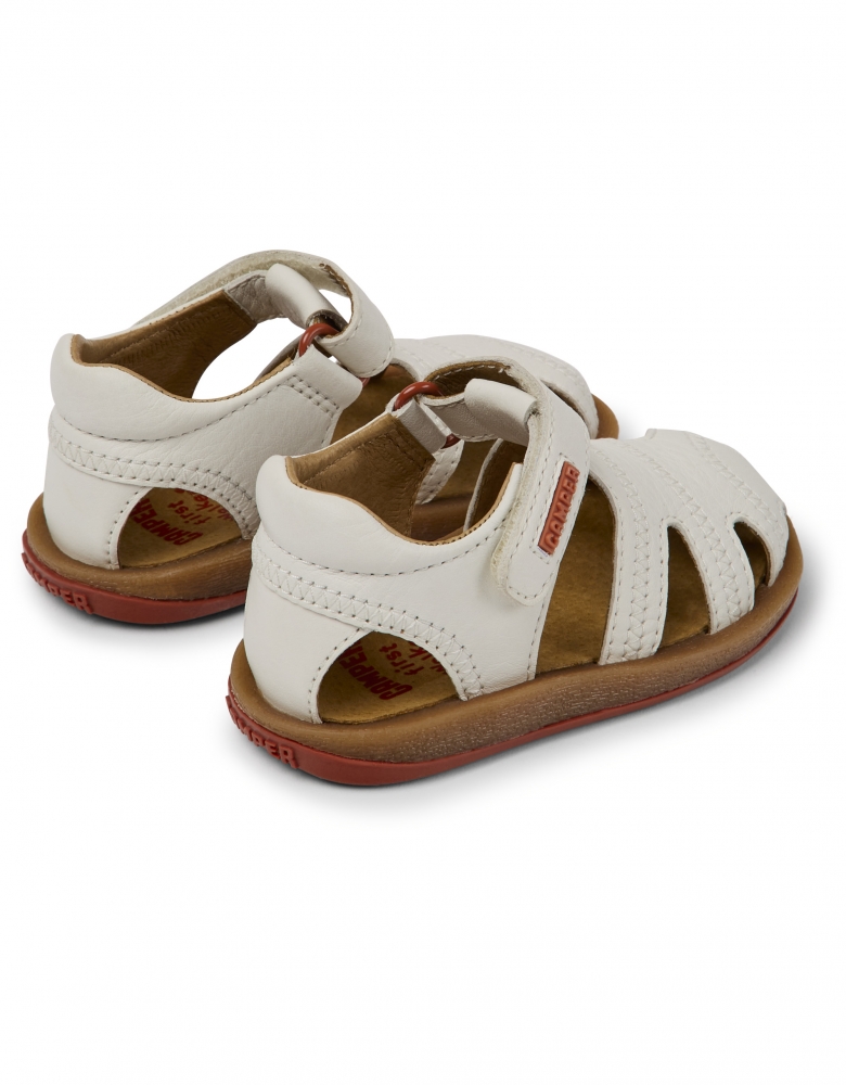 Sandalias blancas de piel para niños con sistema de autocierre y suelas 100% goma (20% reciclada).