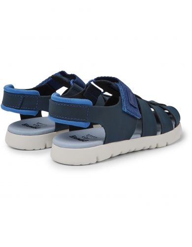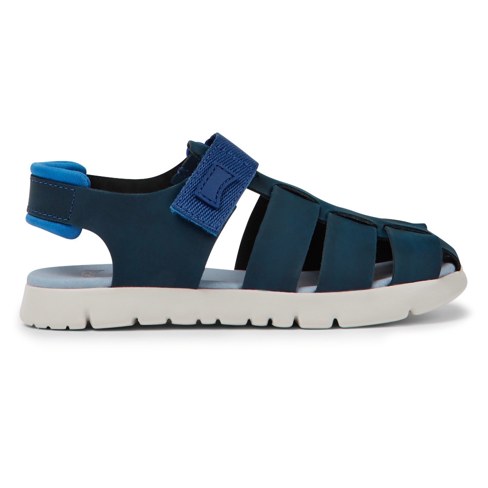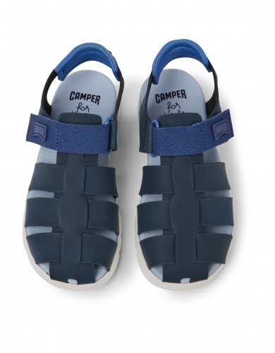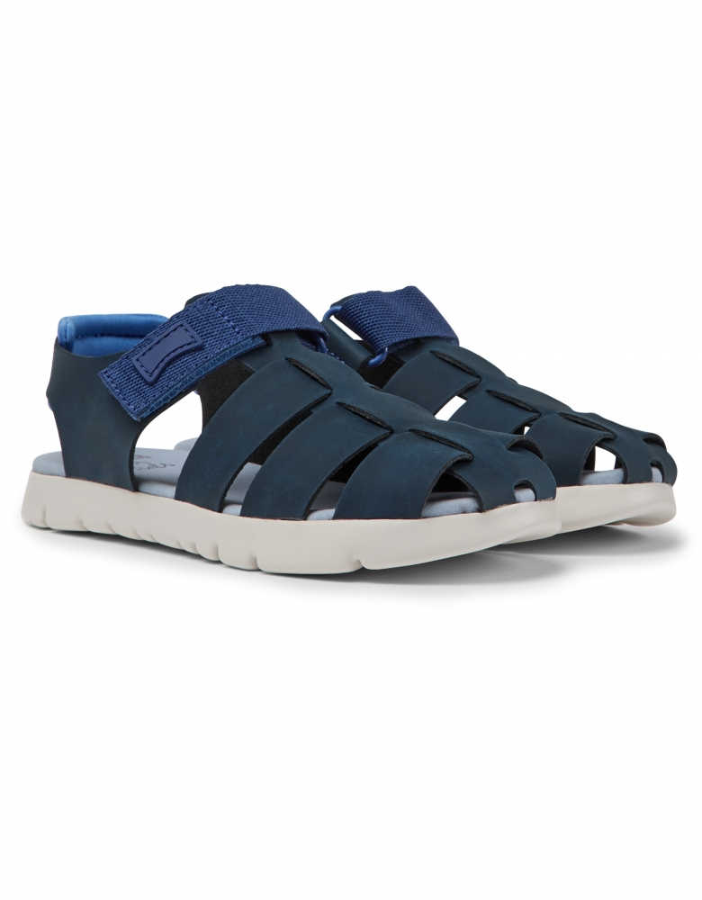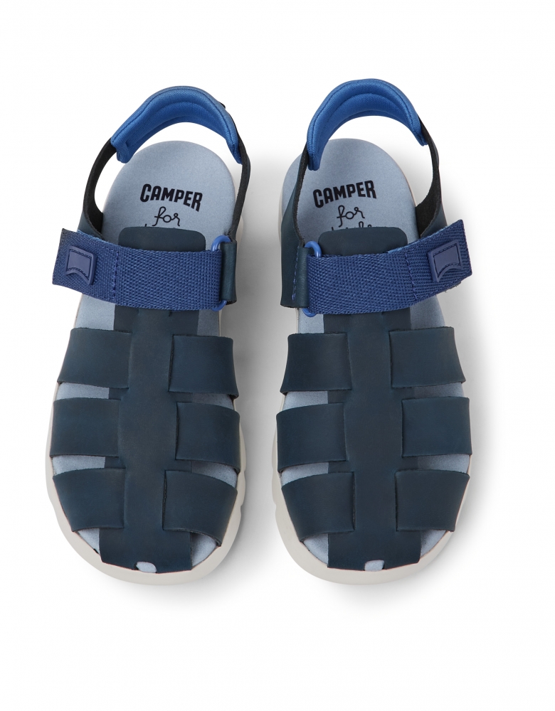 Sandalias azules de piel para niños con cintas de PET reciclado, sistema de autocierre y suelas 100% EVA.