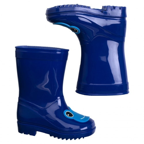 Bota de lluvia de color azul marino con personaje divertido. Puntera redondeada.