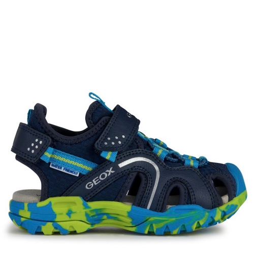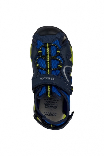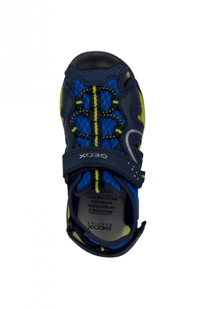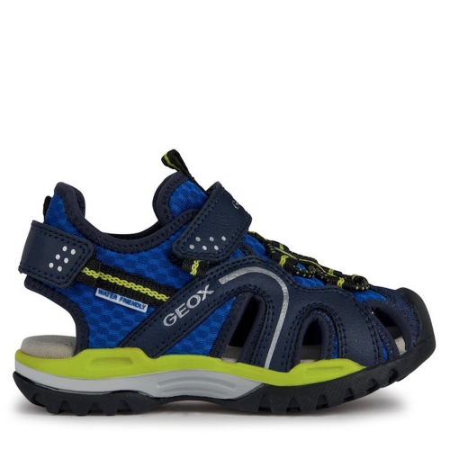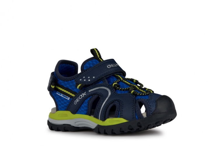 Sandalia de niño, superconfortable y funcional, ideal para las actividades al aire libre. Realizada con materiales hidrófugos, Borealis es una sandalia transpirable que presenta un diseño outdoor con punta cerrada y protectora, ideal para divertirse en verano. Este modelo de malla y material efecto piel encerada alterna el color azul royal y el verde lima, y combina fácilmente con los looks active.