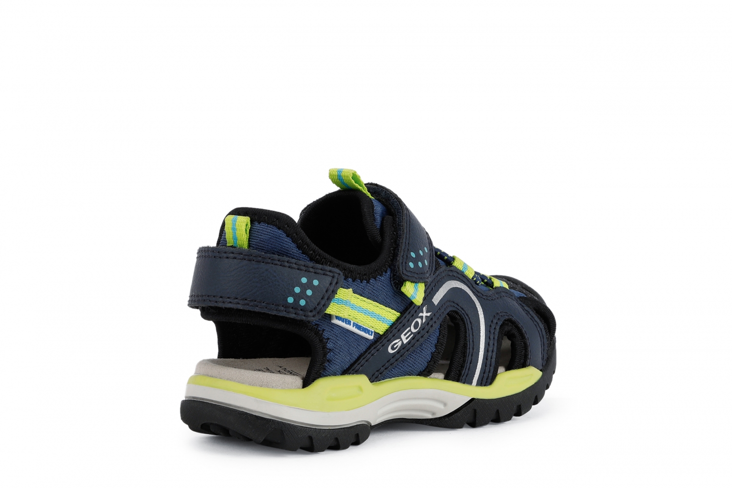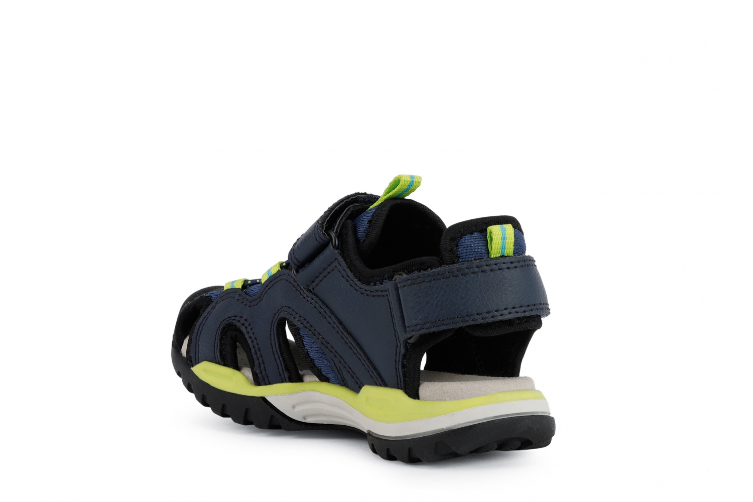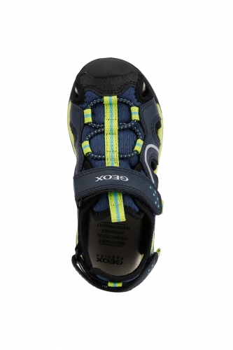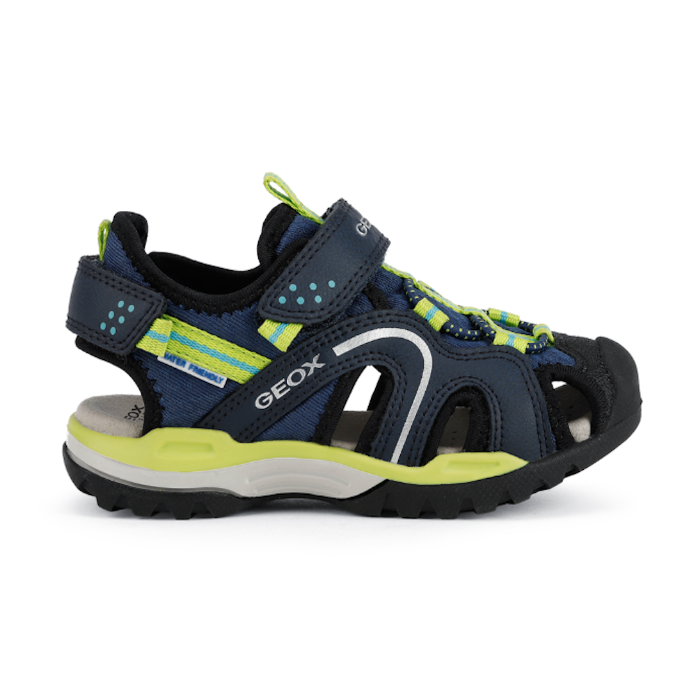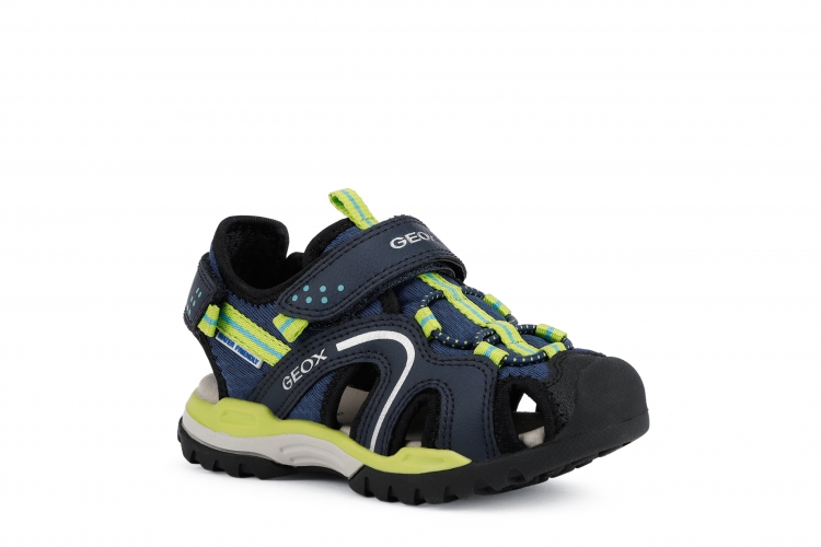 Sandalia de niño, impermeable y superconfortable. La sandalia Borealis es la compañera ideal para los juegos de verano y las actividades al aire libre incluso con agua, porque utiliza materiales hidrófugos que se secan rápidamente. Su diseño outdoor, confortable y funcional, protege el pie con la punta cerrada y permite un calce y un ajuste inmediatos. Realizada con malla y material efecto piel encerada, es de color azul marino y lima.