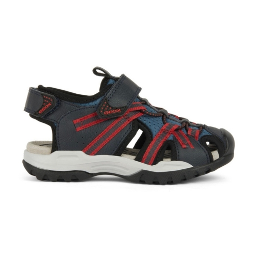 Sandalia cerrada de niño transpirable y protectora, de diseño outdoor, ideal para las aventuras de verano. Esta versión de Borealis, con una empella de color azul avio con detalles rojos en contraste, es ligera y totalmente regulable. Realizado con malla y material efecto piel encerada, este modelo cuenta con una punta reforzada que protege contra golpes e impactos junto con una suela de elevada adherencia.