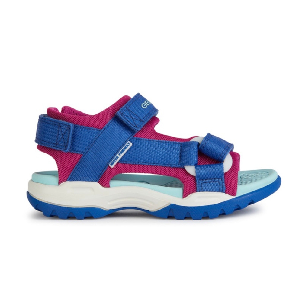 Sandalia de niña de estilo outdoor, deportivo y resistente al agua. Este modelo ligero y práctico de regular, con su alegre empella de color azul y rojo, se convertirá en el compañero ideal durante todas sus aventuras de verano al aire libre. Borealis, realizada con malla y tejido, se seca fácilmente y cuenta con una suela especial que garantiza una elevada adherencia incluso en terrenos resbaladizos.
