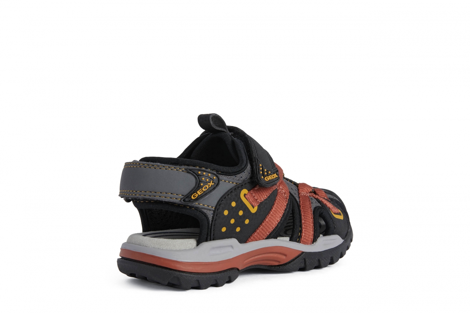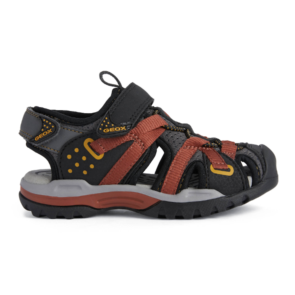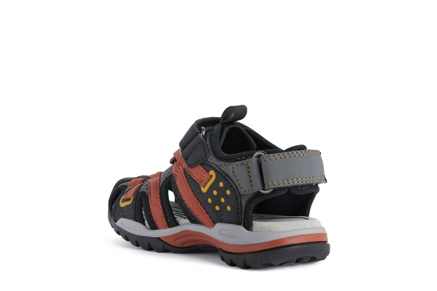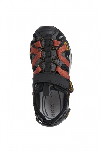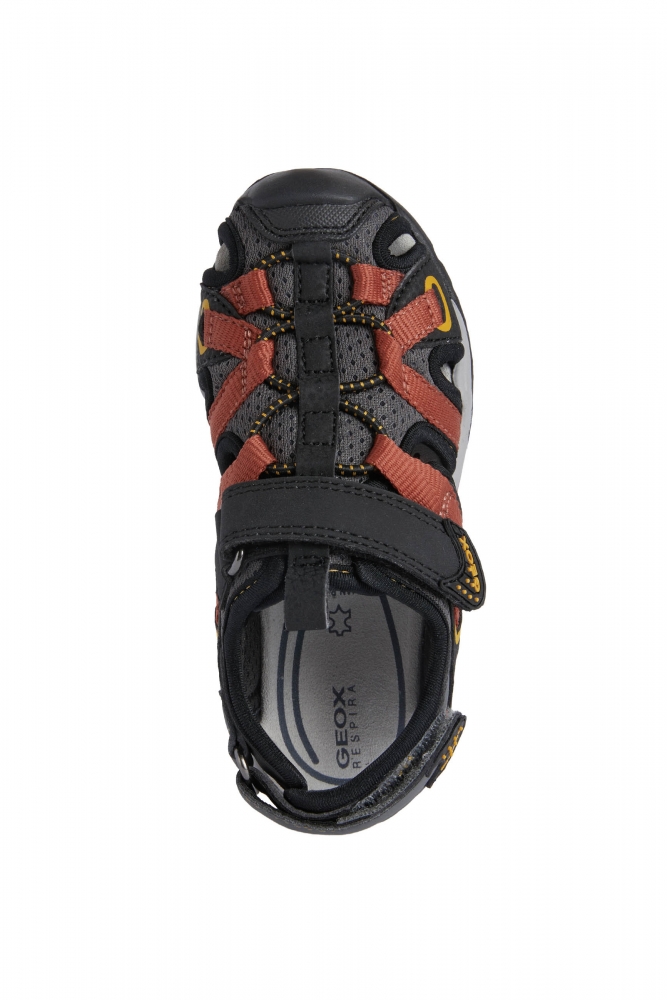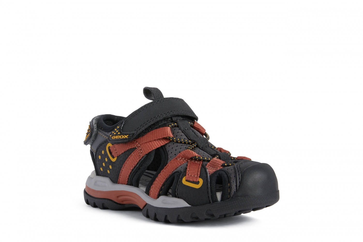 Sandalia de niño outdoor, resistente, transpirante y confortable. Borealis es una sandalia cómodamente regulable con punta reforzada, diseñada para seguir a los niños en sus actividades al aire libre, sin renunciar al confort, el estilo y la resistencia. En esta versión, el modelo está realizado en durabuck estampado y malla en los tonos negro, con detalles en contraste en rojo.