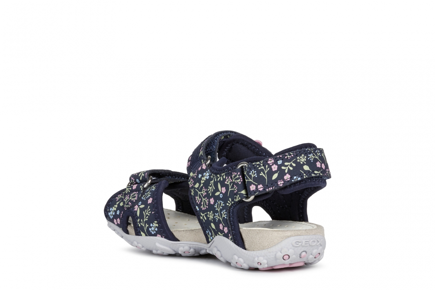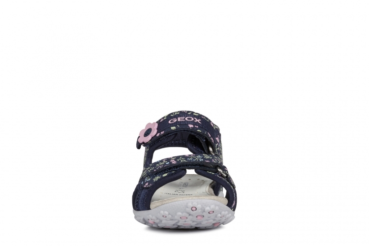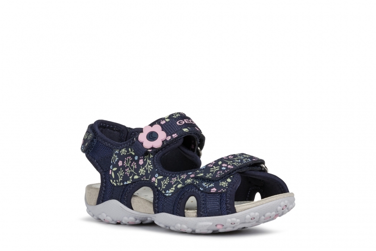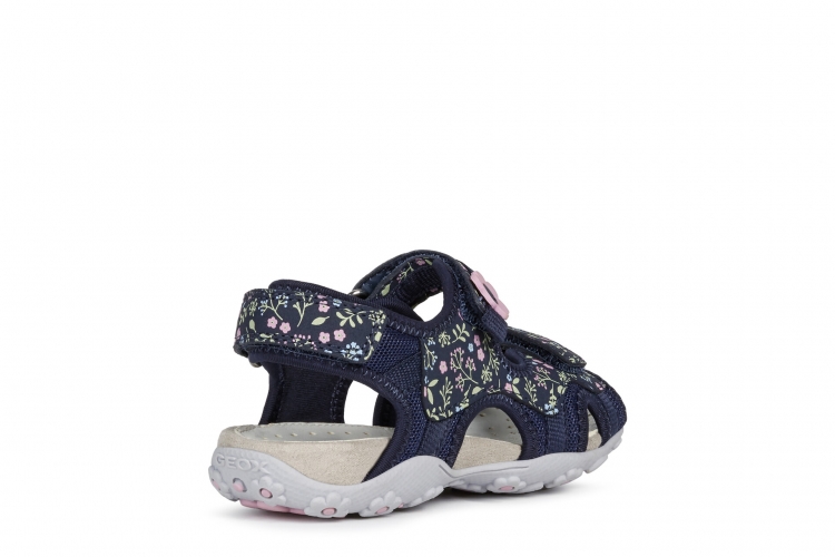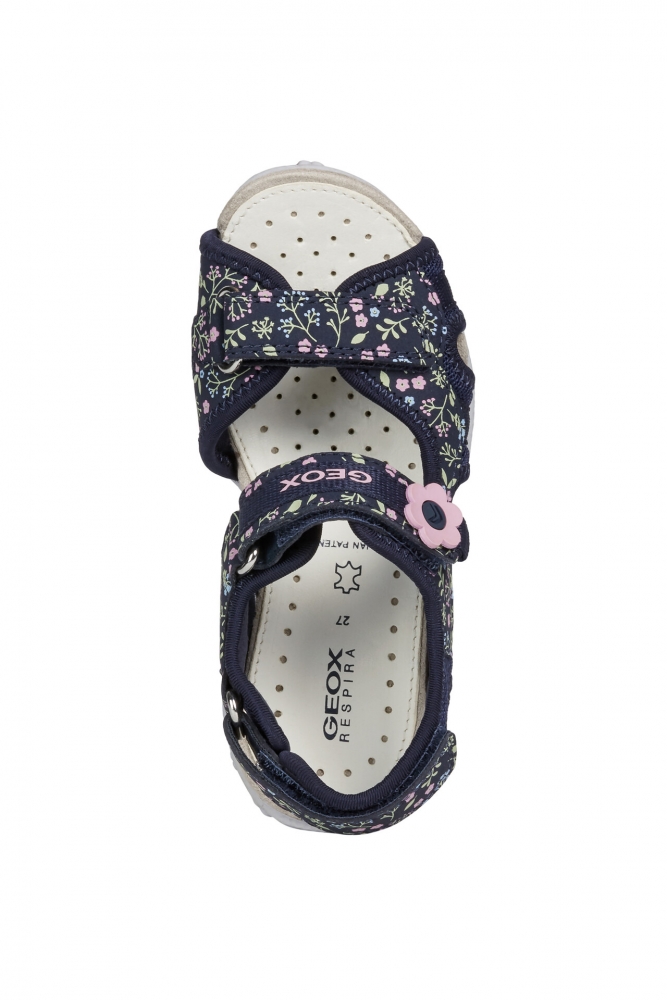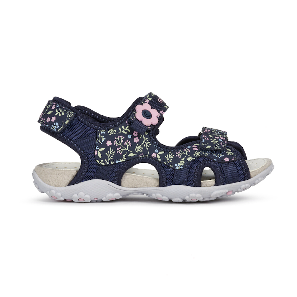 Sandalia de niña confortable y transpirante, adecuada para el uso cotidiano.Pensada para un estilo de vida en movimiento, sin renunciar a la feminidad, Roxanne es una sandalia versátil de malla y durabuck estampada en azul marino oscuro con un gracioso detalle con forma de flor.