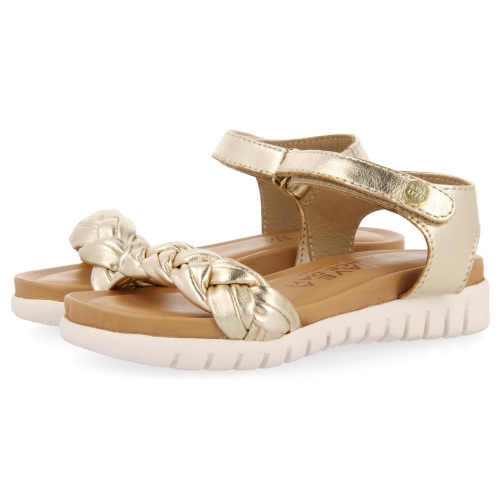 Sandalias de piel en color oro muy suave. Pala con trenza tubular acolchada. Talón con tira ajustable/regulable. Suela blanca con volumen. La plantilla es anatómica en piel suave muy acolchada con planta de látex. El forro es en piel y el piso TPR muy flexible. Plantilla anatómica en piel suave. Plantilla muy acolchada. Planta de látex. Forro en piel. Piso TPR muy flexible.
