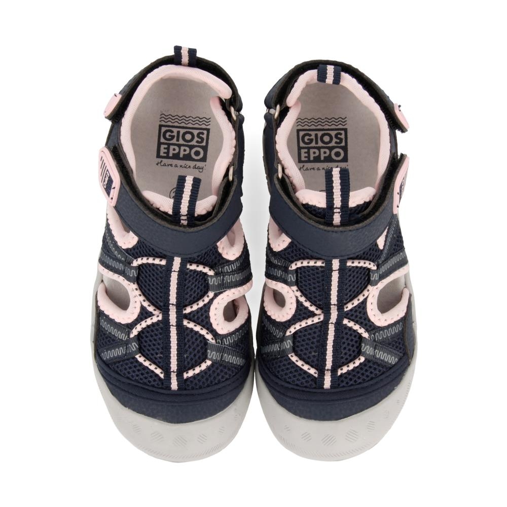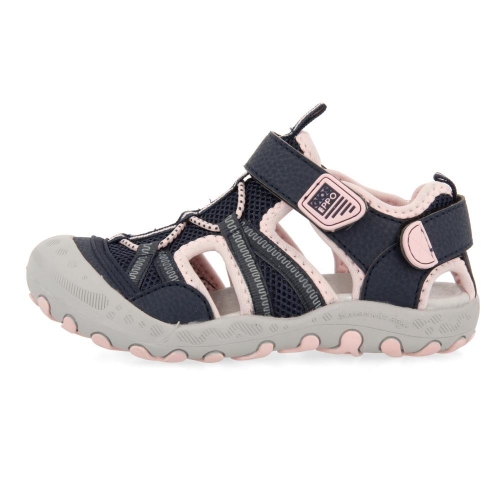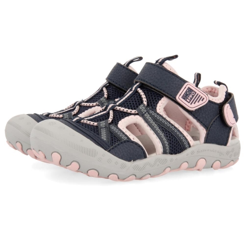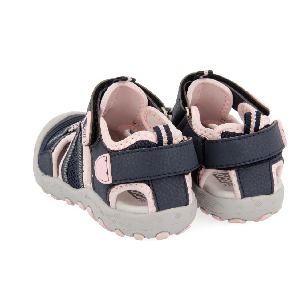 Chanclas deportivas azul marino con detalles en rosa pastel. Cierre de velcro al tobillo. Puntera reforzada.