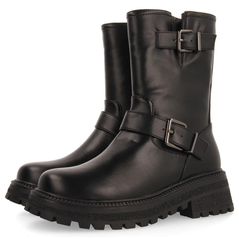¡Imprescindibles para este invierno! Botas negras tipo biker con hebillas. Suela tipo track al tono. Cremallera interior para facilitar el calce. Planta transpirable acolchada y muy confortable. Forro transpirable.