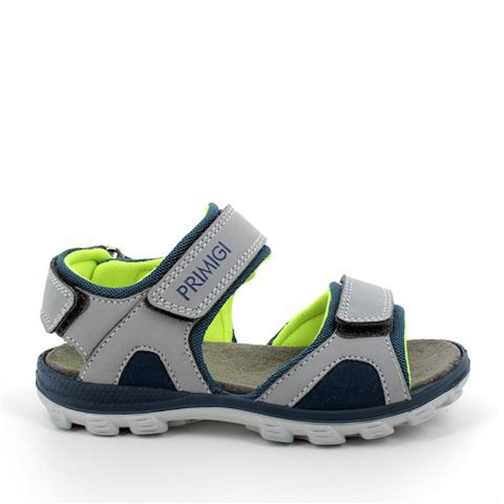 Sandalia de la marca Primigi de color gris i verd con tres velcros ajustables.