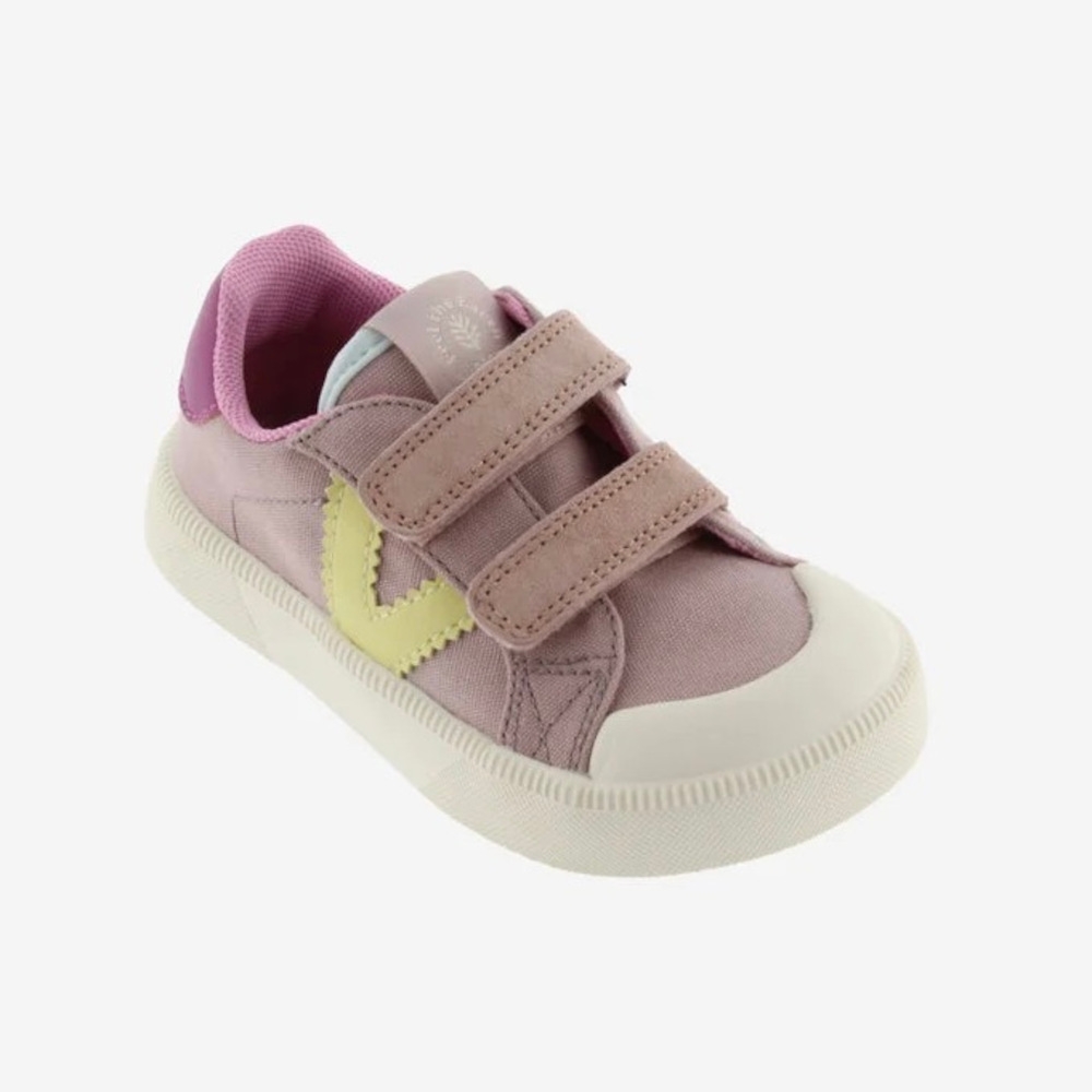 Zapatillas deportivas multicolor barefoot para niños fabricadas en lona. Cierre de tiras adherentes (dos hasta la talla 35 y tres a partir de la 36) que aportan mayor sujección y facilitan el calce, fomentando su autonomía.