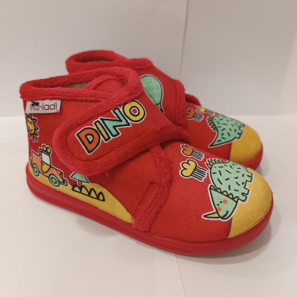 Zapatillas de casa cerradas Vul·ladi de color rojo y con dibujo Dino. Calzado infantil elaborado en tejido invernal. Cálido interior en micropolar. Diseño original. Suela de caucho natural. Cierre con velcro.